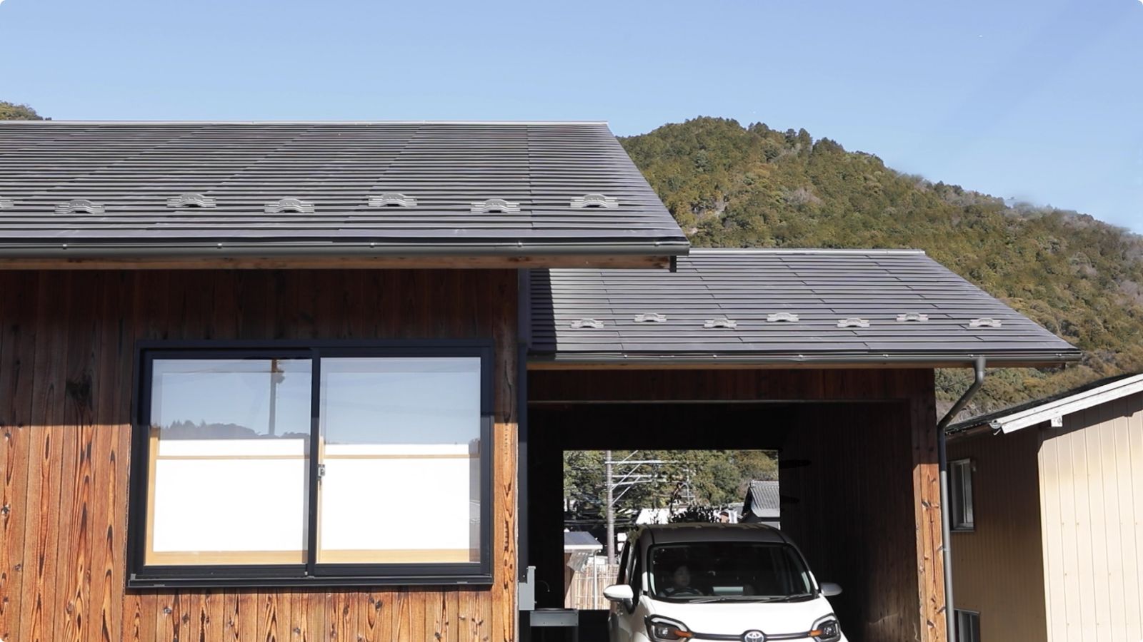 具体的には、参道を通る人々の視点から見たとき、山の稜線と屋根の形状が寄り添うように設計。外壁材は風景に溶け込む焼杉張りを採用。車庫もアルミのカーポートでは周囲の景観から浮くため、建物と一体にして溶け込む佇まいに。インナーガレージ形式にすることで、雨の日でも濡れることなく車の乗り降りができ、使い勝手の良さを向上させています。