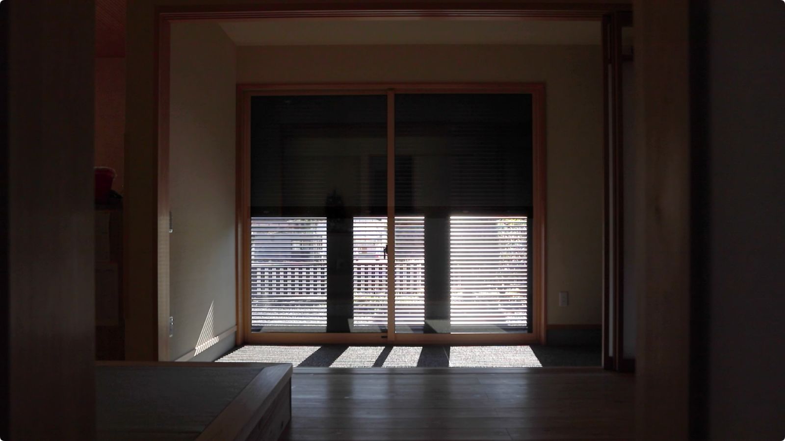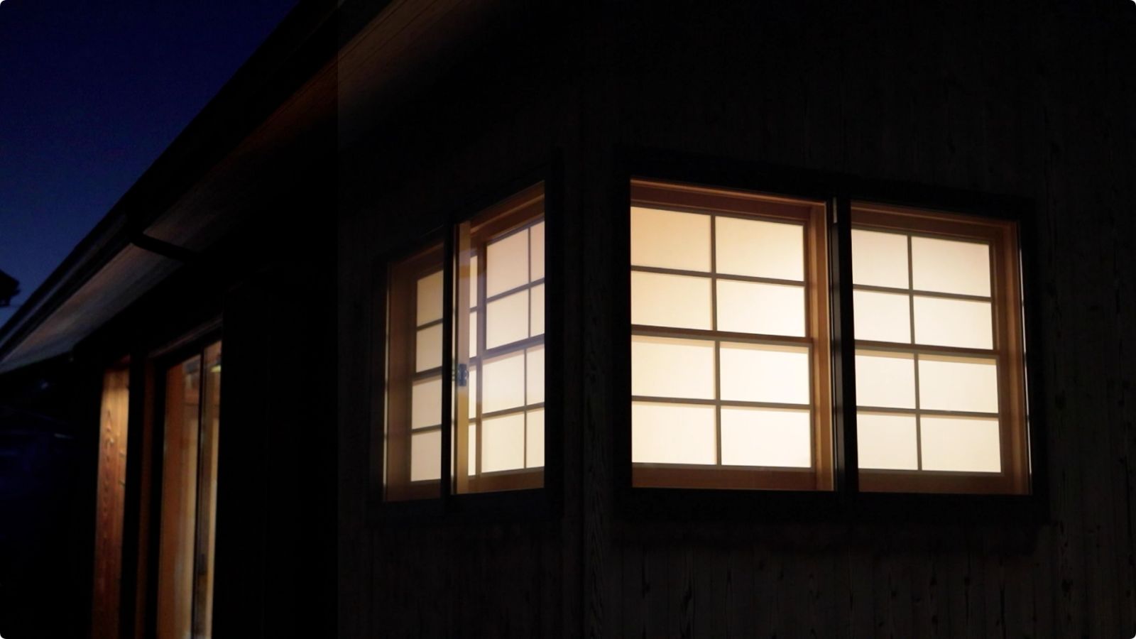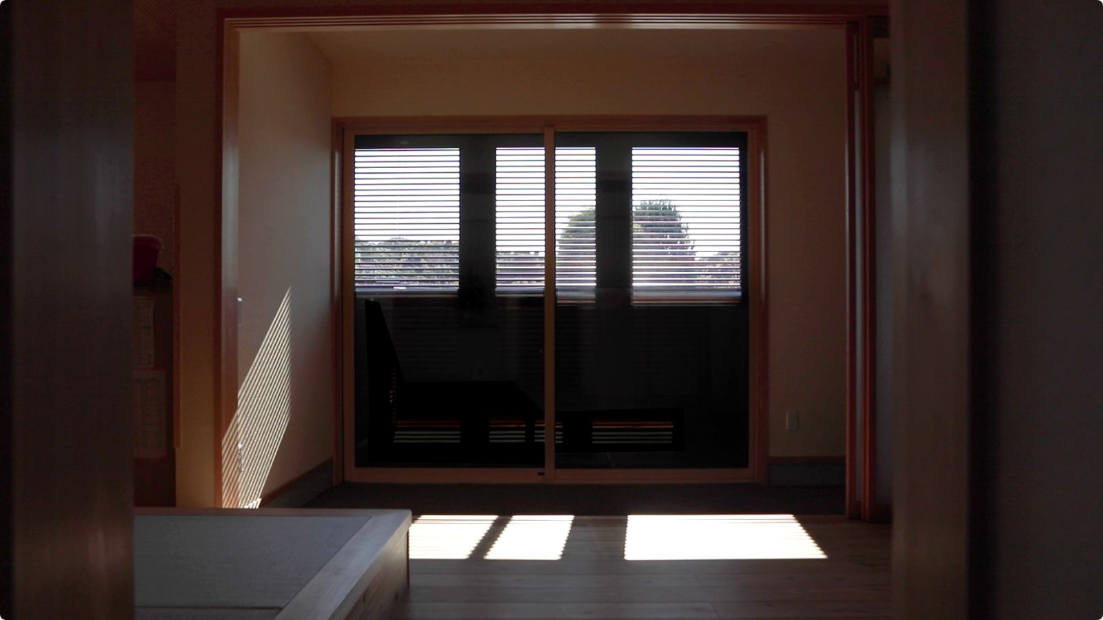 同じ敷地に母屋があり、家族同士のコミュニケーションが自然に進む窓口として、土間の窓がその役割を果たします。この窓の雨戸は可動ルーバー型。夏、ルーバーの角度を調整することで室内に入る陽射しをやわらげ、外部の視線も遮りながらも通風は確保。雨戸を施錠すれば窓を網戸のままにしても風を通せるため、留守中でも安心です。