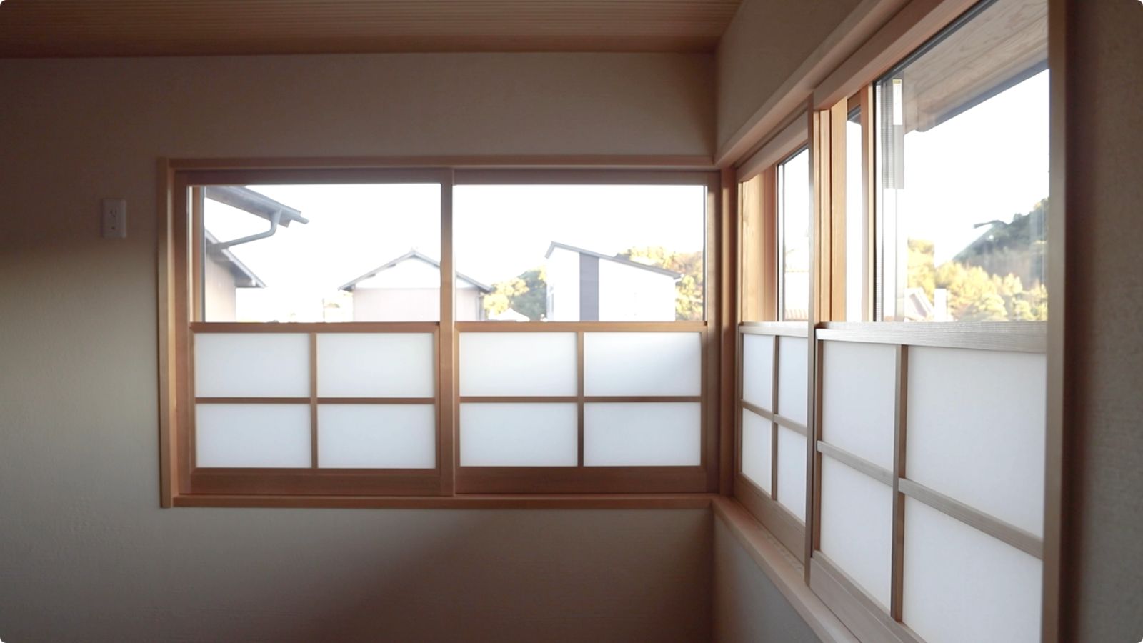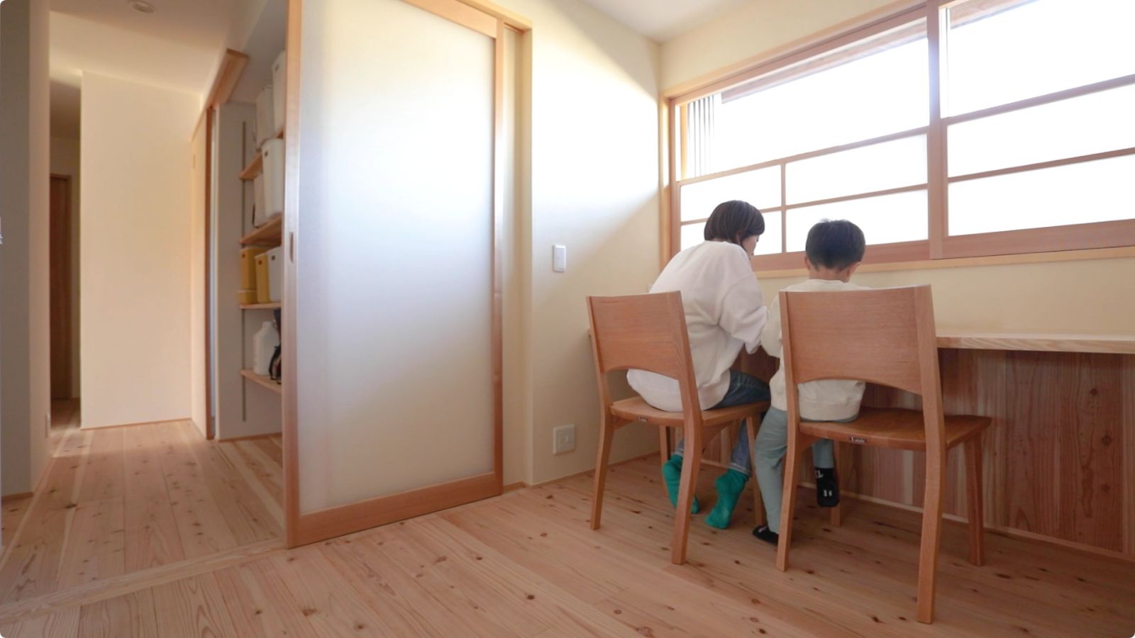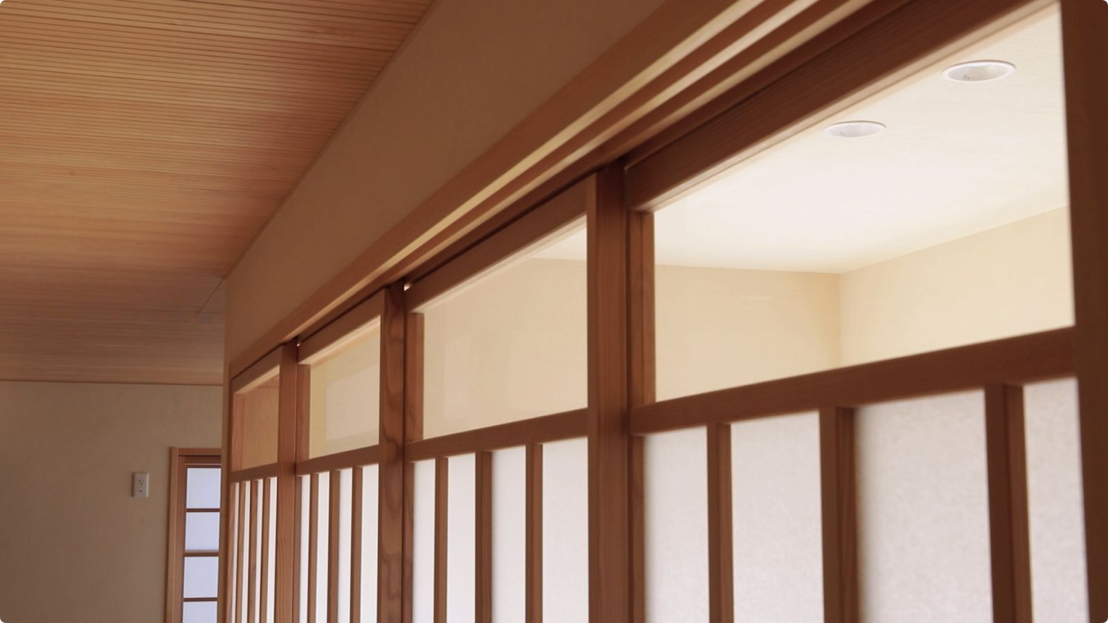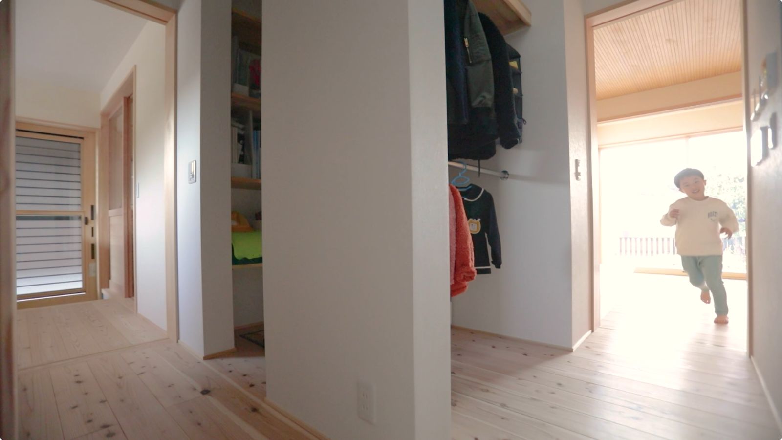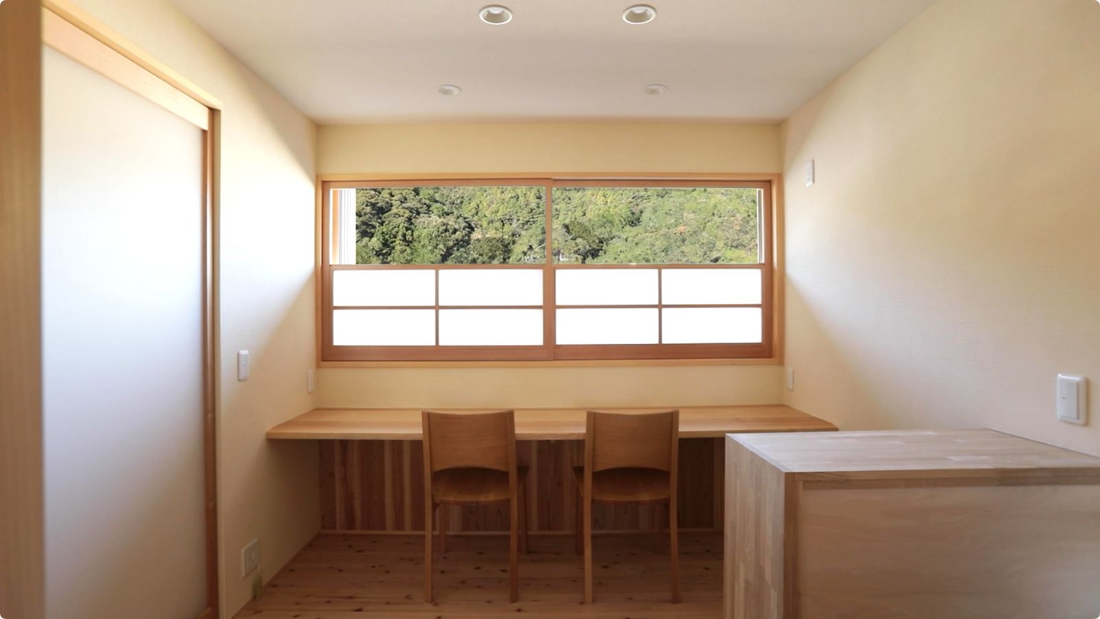 狭小平屋の収納スペースは、建物中央に集約。廊下を無くし、どの部屋からも直接行ききできる使い勝手の良いウォーキングクローゼットを配置。フリースペースは背景の山を眺望できるように設計。ただ、そのまま大きく窓を開けると隣地からの視線が気になるため、障子を使って山の風景だけを切り取って眺められる内障子を設置。この空間は奥様の家事室や子供の勉強部屋、在宅ワークなど多目的に活用できます。