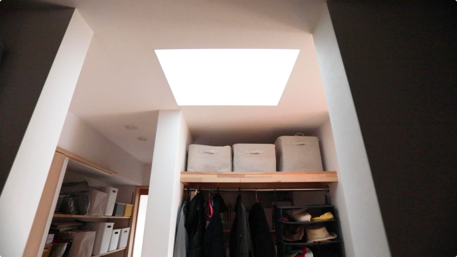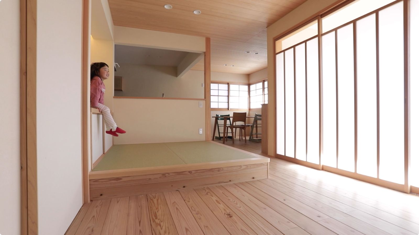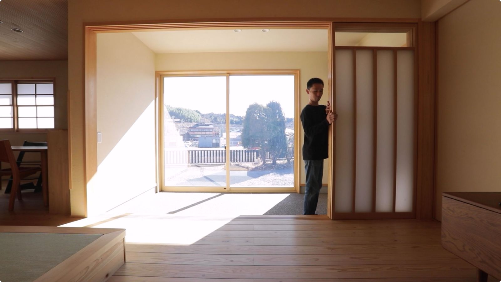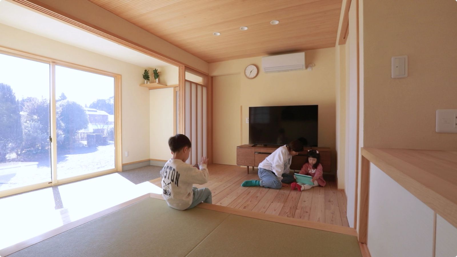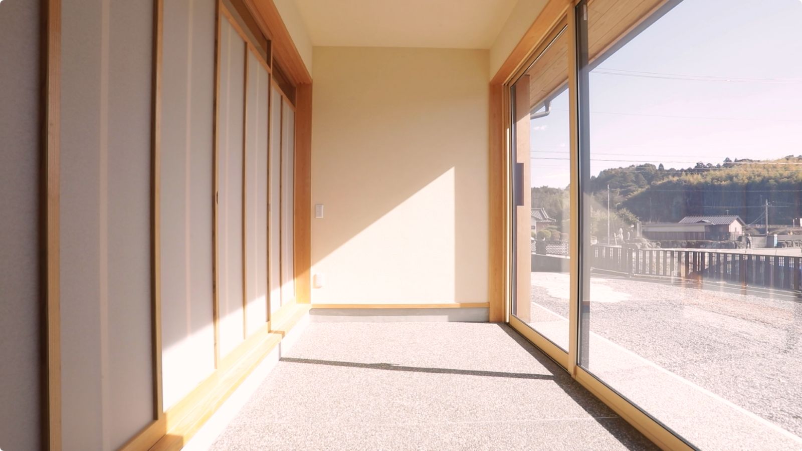 狭小平屋の収納スペースは、建物中央に集約。廊下を無くし、どの部屋からも直接行ききできる使い勝手の良いウォーキングクローゼットを配置。フリースペースは背景の山を眺望できるように設計。ただ、そのまま大きく窓を開けると隣地からの視線が気になるため、障子を使って山の風景だけを切り取って眺められる内障子を設置。この空間は奥様の家事室や子供の勉強部屋、在宅ワークなど多目的に活用できます。