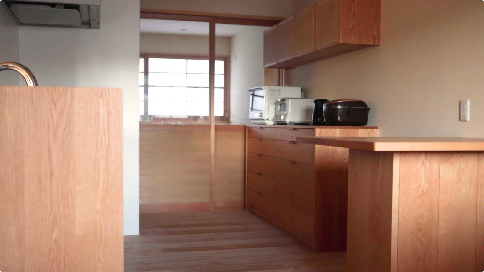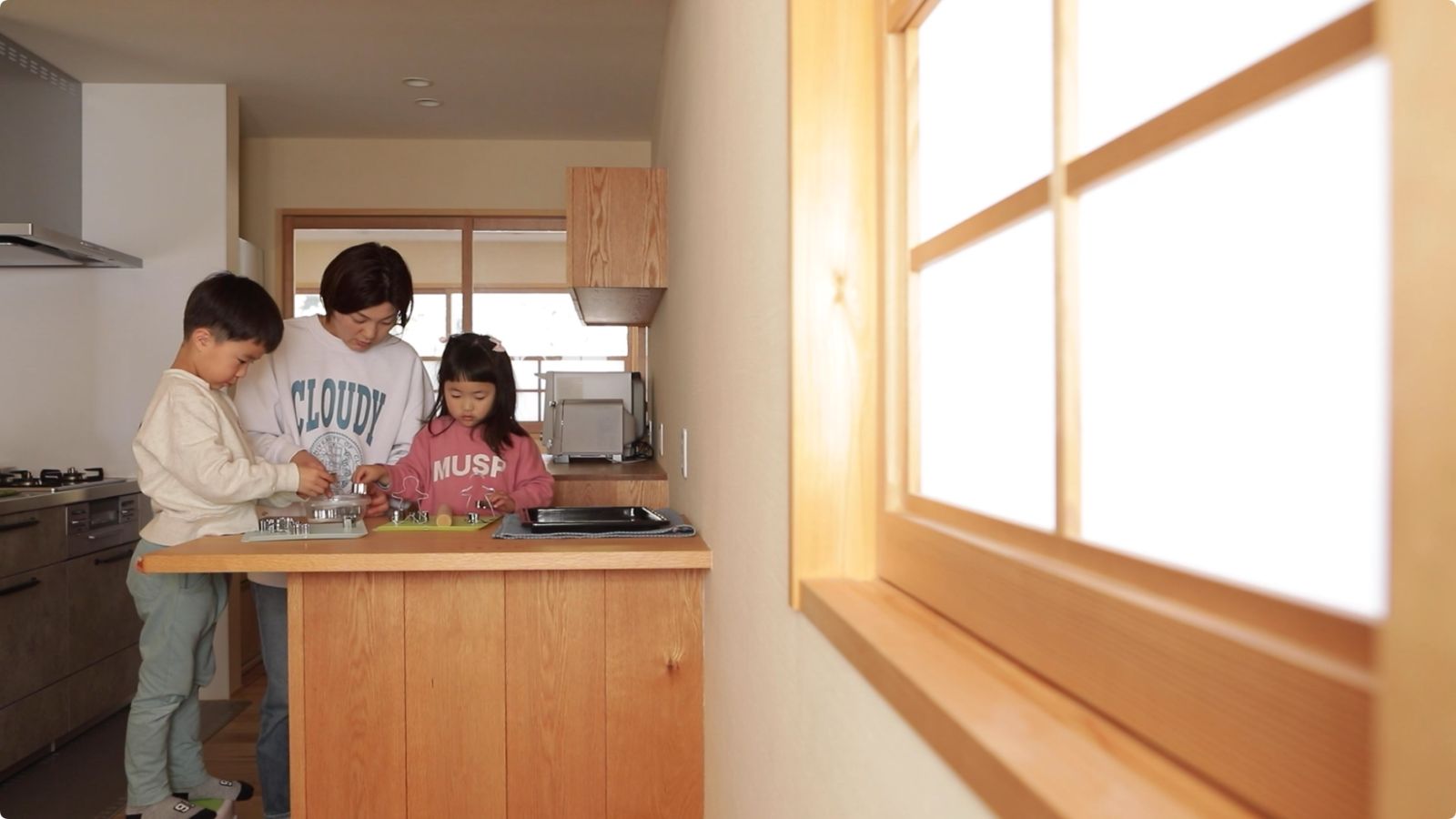 キッチンには奥様の思いに沿ったオリジナルで造ったカップボードと、弊社が提案した作業台を設置。作業台は子供達と料理したり、奥様の机になったり、夫婦の立ち飲み場にと色々な用途に使えます。 今回、狭小の住まいをどれだけ豊かな空間、気持ちにできるのか、それが使命でした。